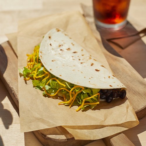 A warm-and-flaky flatbread shell filled with slow-simmered black beans, lettuce, diced tomatoes, a blend of mozzarella, pepperjack, and cheddar cheeses, and reduced-fat sour cream. Item is lacto-ovo, allowing for dairy & egg consumption. Preparation methods may lead to cross contact with meat. See ta.co for full details.